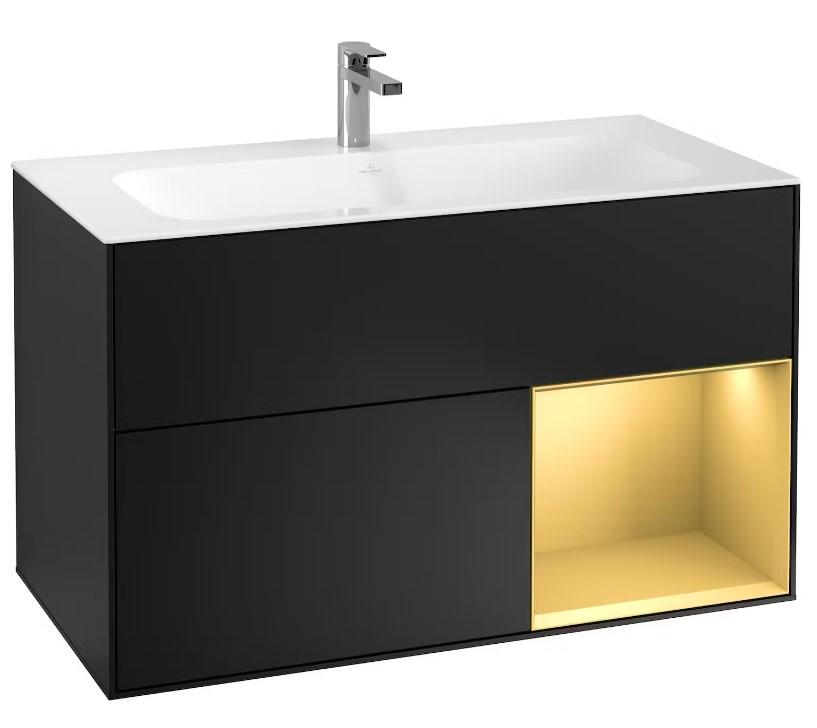 Finion Vanity unit, with lighting, 2 pull-out compartments, 996 x 591 x 498 mm, Black Matt Lacquer / Gold Matt Lacquer